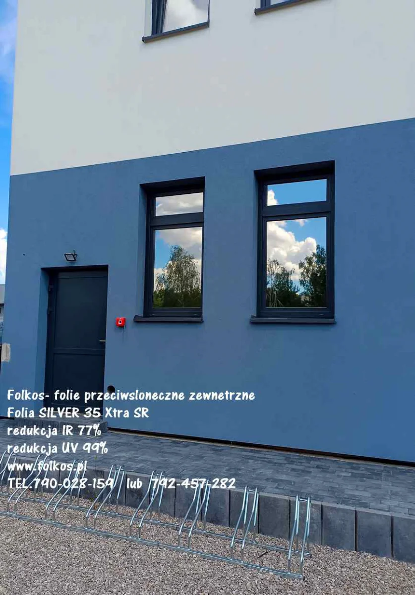 Folia przeciwsłoneczna w 100% zaciemniająca -występuje w 2-ch wersjach lustro-biały mat oraz lustro czarny mat -redukcja UV99%, redukcja IR 99%, redukcja rażenia słonecznego 100%