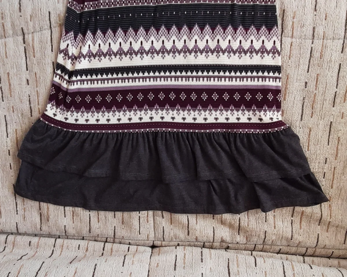 Sprzedam: turecka, bardzo dziewczęca sukienka, z oryginalnym wzorem i z fajnego materiału; lekko rozciągliwa, rozmiar EU 36-38, zakończona dwiema falbanami. Długość całkowita ok. 97 cm, krótki rękaw (długość z mankietem 29 cm). Stan bardzo dobry (zdjęcia) – jak nowa. Sukienka przewiewna, pięknie układa się na sylwetce, bardzo efektowna, praktyczna i wygodna, można prać w pralce (nie wymaga prasowania).